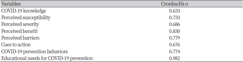 Lee KH(14)의 연구에서 건강신념의 지각된 민감성, 심각성, 유익성, 장애성, 행동계기 신뢰도는 각각 Cronbach’s α=0.921, Cronbach’s α=0.912, Cronbach’s α=0.896, Cronbach’s α=0.875, Cronbach’s α=0.884였다. 본 연구에서 건강신념의 지각된 감수성, 심각성, 유익성, 장애성, 행동계기 신뢰도는 Table 1과 같다. 코로나19에 대한 예방행동 실천정도, 예방교육요구도의 측정도구는 Kim JH 등(15)이 개발한 문항으로 본 연구에 맞게 수정 보완하여 사용하였다. 먼저, 코로나19에 대한 예방행위 수행도는 손씻기, 기침예절, 마스크 착용법, 사회적 거리두기, 소독 등 총 8문항으로 구성되어 있고, Kim JH 등(15)의 연구에서는 Cronbach’s α=0.79이며, 본 연구에서 신뢰도는 Table 1과 같다. 코로나19 예방행위 교육요구도는 총6문항이며 격리기준, 전파경로, 질환의 특성, 치료방법, 진단검사방법, 보호장구 착용법으로 구성하였으며, Kim JH 등(15)의 연구에서 Cronbach’s α=0.86 이었고, 본 연구의 신뢰도는 Table 1과 같다.