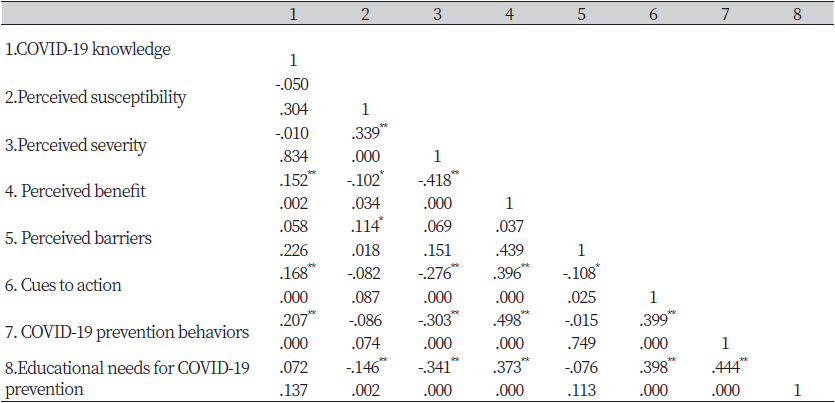 Table 4. Correlation between knowledge about COVID-19, health beliefs, preventive behavior, and education needs